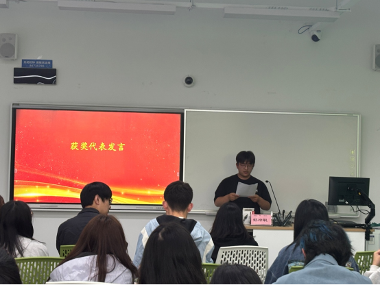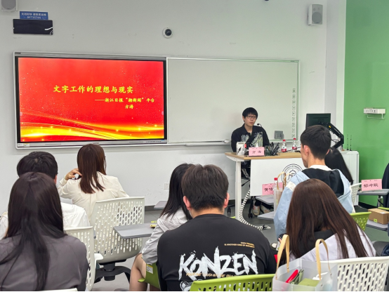 颁奖仪式结束后,浙江日报“潮新闻”平台的记者方涛,作了题为“文字工作的理想与现实”的讲座。他分享了行业的发展状况、从业者应具备的能力素养等,并从媒体一线从业者的角度,对学校人才培养、学生的自我锻炼、创作需要注意的事项等方面提出了意见和建议。作为本次大赛的评委,他有针对性地对同学们的作品作了评价,提出了进一步修改提高的建议。讲座过程中,他还与同学们就创作、就业等话题进行深入交流,鼓励同学们利用闲余时间积极锻炼自己,勇于尝试,挖掘自己在文字工作方面的兴趣与热爱,把握每一个自我提升的机会,丰富自己的实习经历。