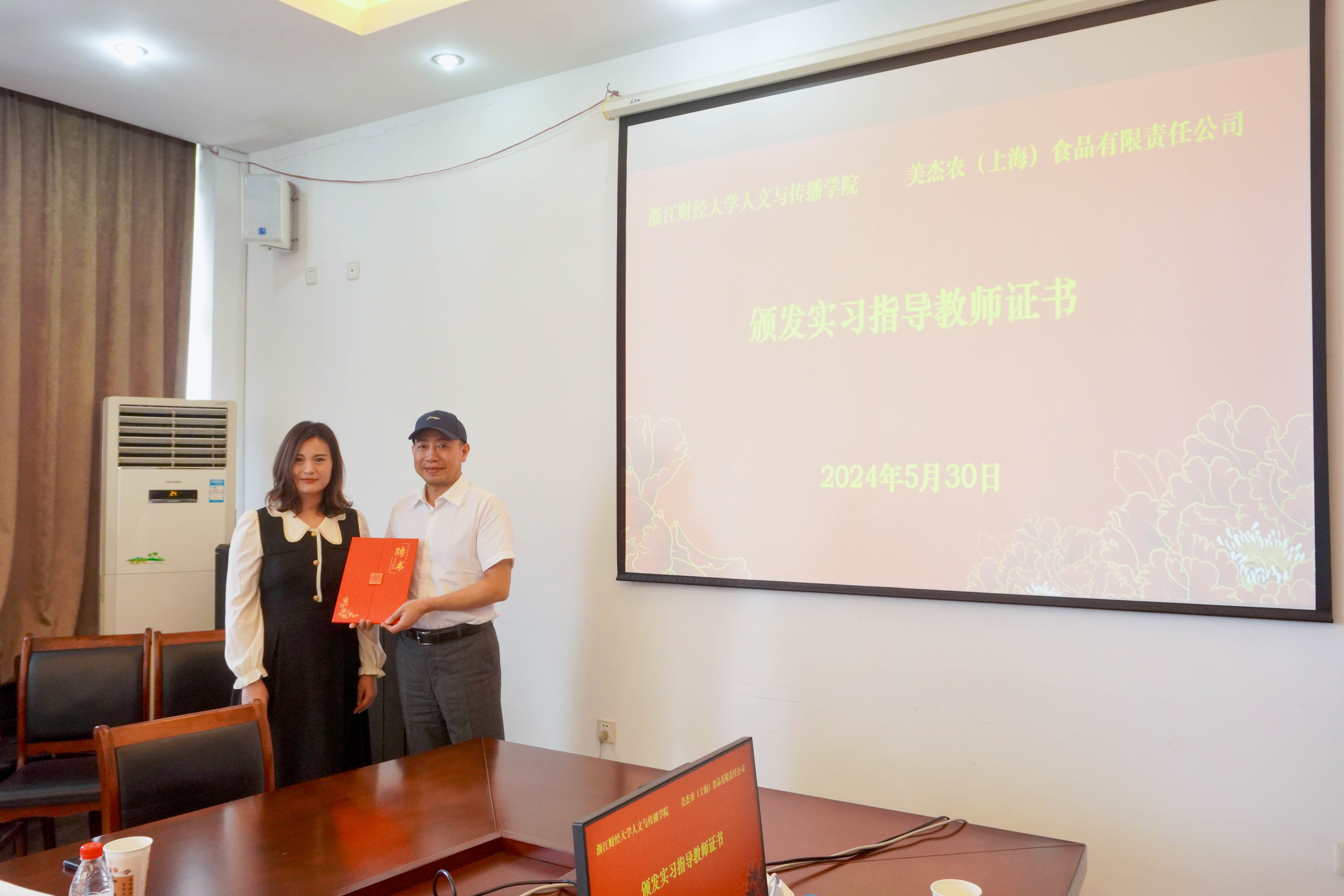 党委书记罗金艳与美杰农(上海)食品有限责任公司肖和成董事长共同签署了“美杰农教育基金”捐赠协议,林香娥副院长与肖和成董事长共同签订了校外实践教育基地协议,同时毋丹副院长向肖和成董事长颁发了实习指导教师证书。