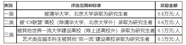 国(境)外奖学金用于资助学生通过自主申请赴海外名校攻读研究生。根据学生录取高校在世界大学三大排名榜中的综合排名,名校研究生奖学金分“一类”、“二类”、“三类”、“优秀类”,评选范围和标准、奖励金额如下: