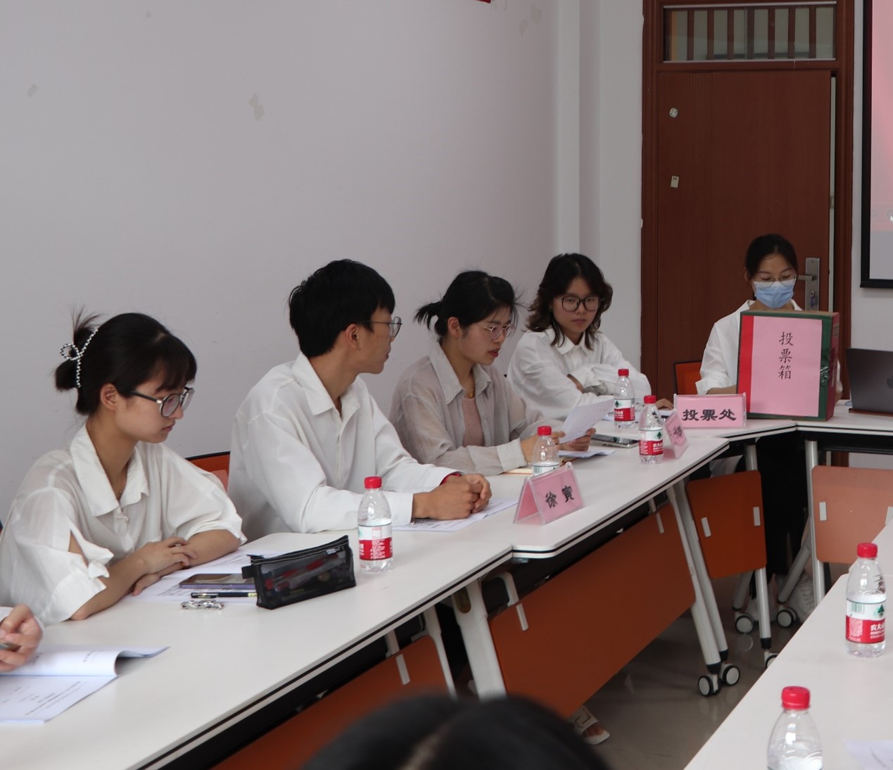 委员会委员和主席团成员选举,总监票人刘华婷老师全程核实,各研究生代表填写投票,计票人统计各候选人选票,最终由刘华婷老师宣布计票结果,选举卢慧珊、杨佳慧为漫画人