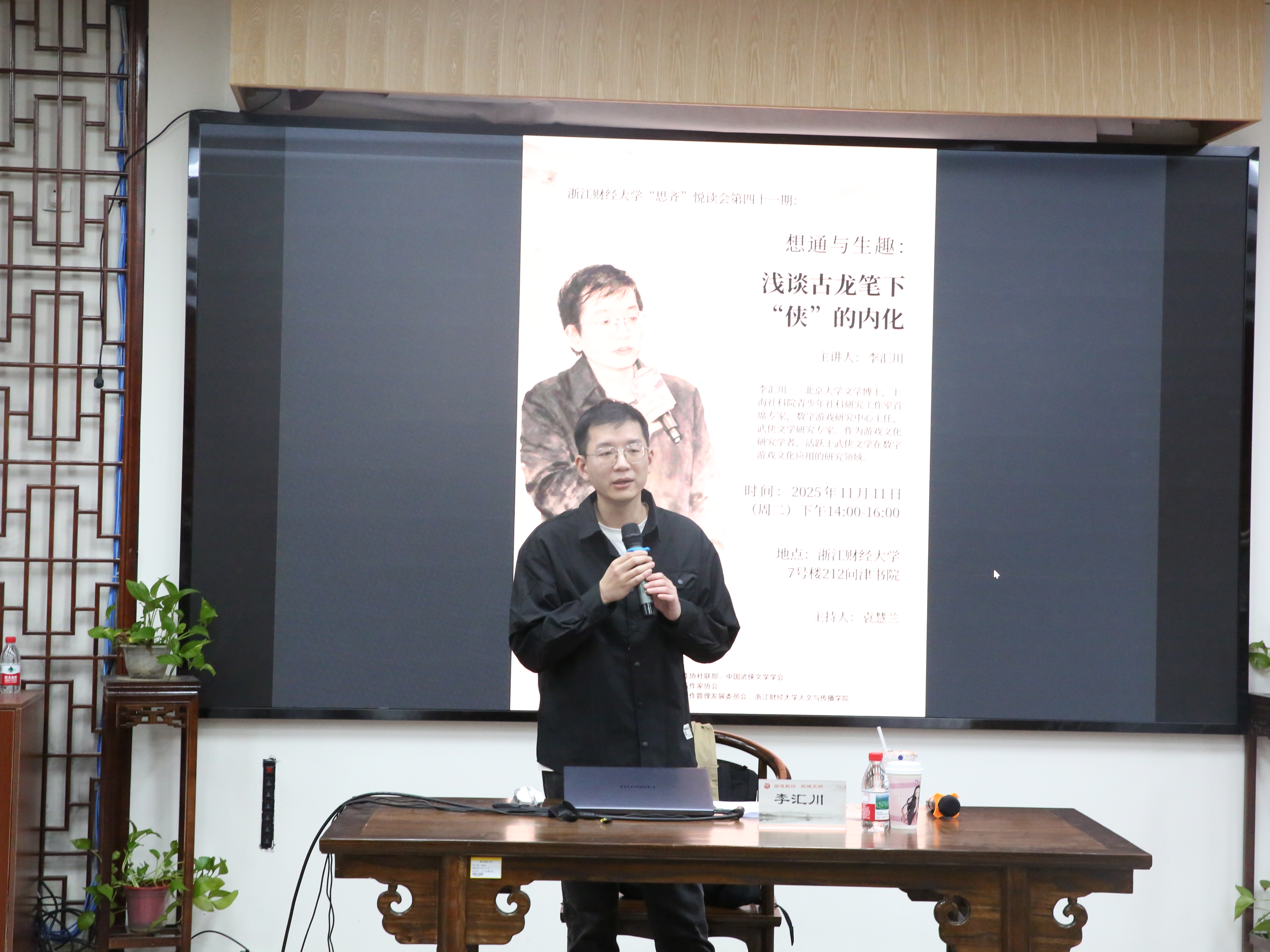 活动伊始,袁慧兰老师向在场师生介绍了古龙的文学成就及其在中国武侠小说史上的重要地位,并欢迎李汇川博士的到来。古龙,新派武侠小说泰斗,历经四十八载人生写就了七十余部江湖传奇,与金庸、梁羽生、温瑞安并称为中国武侠小说四大宗师,其作品底色始终交融着他个人人生的传奇与悲怆,形成了其独有的艺术风格和表达方式。李汇川博士作为武侠文学与数字文化研究领域的专家,长期关注古龙作品的现代性表达,此次他将以“想通和生趣”为题,引领师生走进古龙独特的江湖世界,体悟古龙笔下侠客的自我救赎。