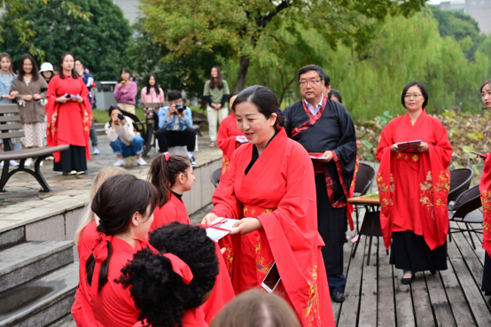高燕书记致辞之后,活动进入第一个环节:太学入学礼。该环节分为五项,分别是释菜礼、敬茶礼、老师回礼、诗歌吟唱和击鼓明志。