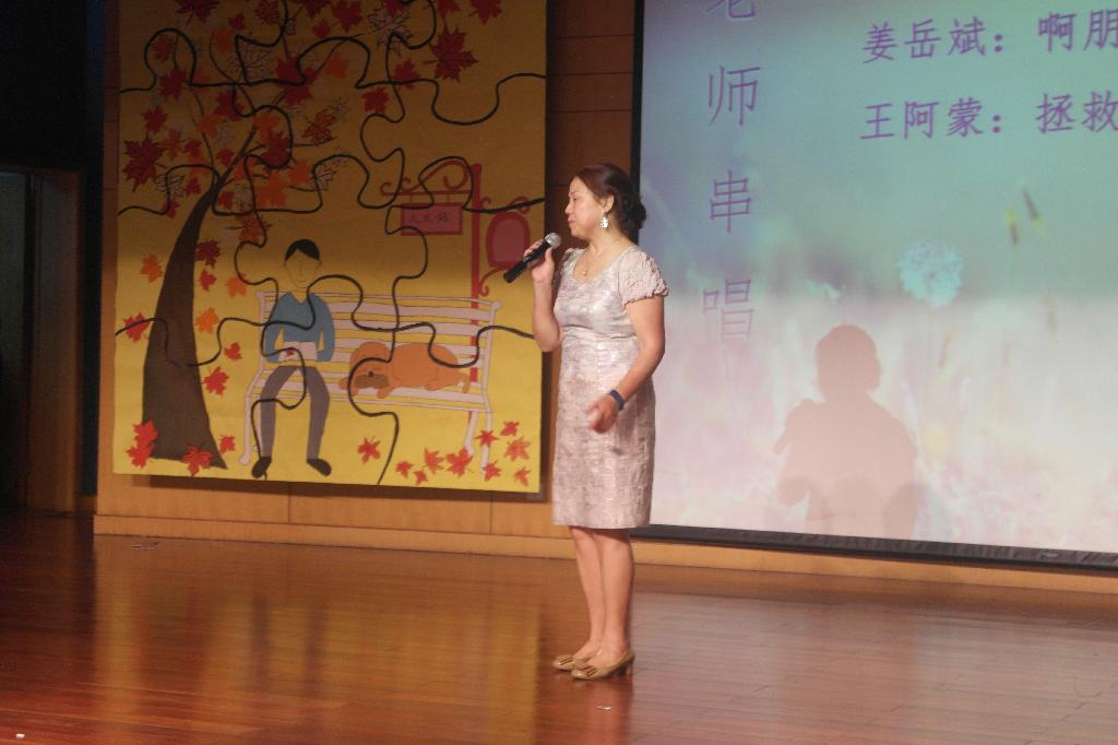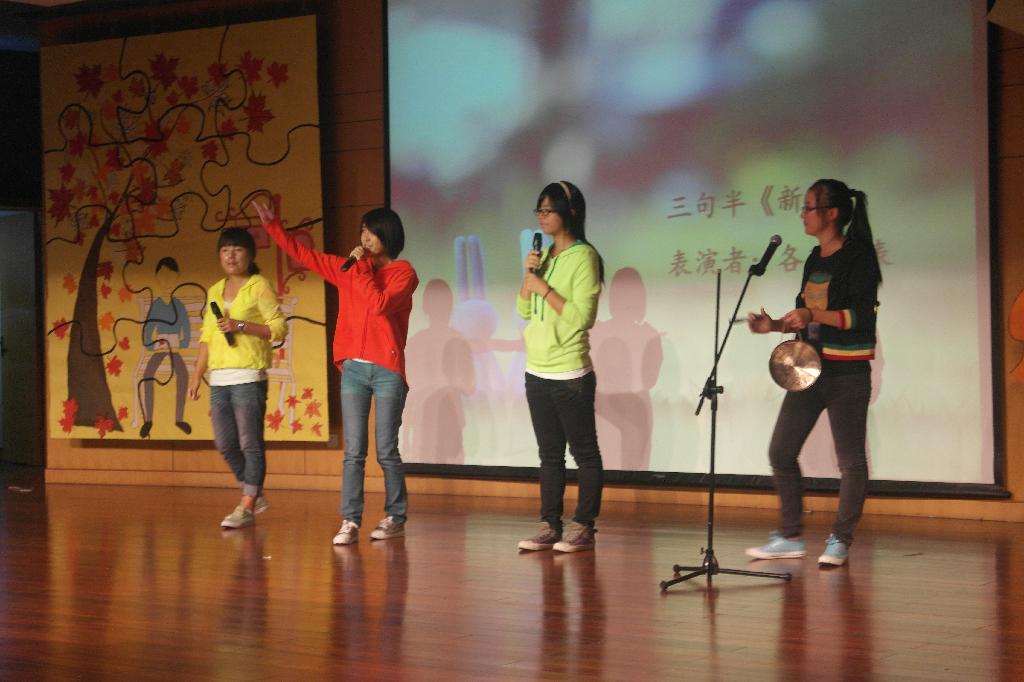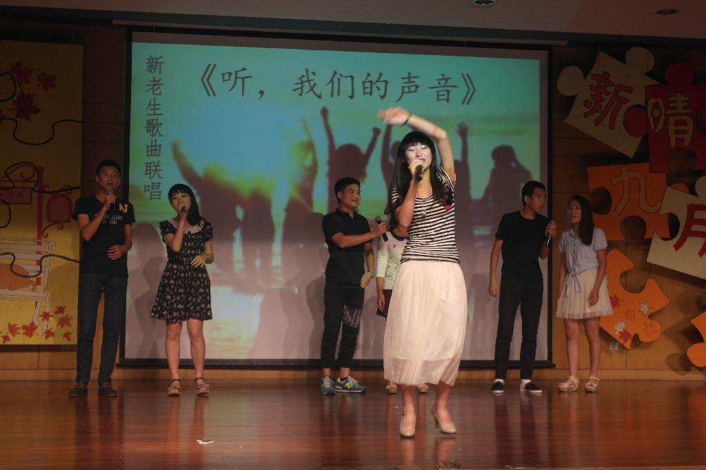 “……这是绿叶对根的情意……”唱着歌缓步出场的美女是谁?不是新手代表,也不是往届学姐,而是我们的陈朝霞老师。陈老师以一曲《绿叶对根的情意》开启了学院教师歌曲联唱的序幕,也将晚会带入了第二个篇章。王阿蒙、姜岳斌老师也纷纷登场献唱。台上老师们用情深意长的歌声诉说着对来自四面八方同学们的欢迎,台下同学们高举双手伴随着音乐挥舞。平时严肃的老师们的献歌将整场晚会推向了高潮。艺术团的同学带来的舞斗《舞林争霸》也是精彩非凡,两组同学在舞台上展开斗舞,用激烈的形式向观众们展现出多姿多彩的舞蹈,也赢得了全场观众的阵阵掌声。之后,师生联袂的诗歌朗诵令在场的各位深深体会到诗意的灵魂与生命.