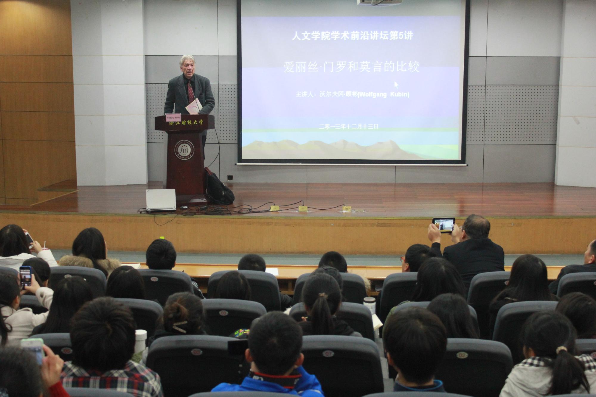 顾彬教授在讲座伊始,首先提出了一个被经常忽略但却又发人深思的问题——“什么是文学?什么又是好文学?”由此开始,顾彬教授以他深厚的文学素养、独特的学术视角、流利的汉语引领同学们对比分析了诺贝尔文学奖获得者爱丽丝.门罗(Alice Ann Munro)和莫言的创作。指出国别的社会现实差异和性别的作家个体差异为两位诺奖作家创作带来的不同,在详细地对比了“当代短片小说大师”门罗和“用魔幻现实主义将民间故事、历史和现代融为一体”的著名长篇小说家的莫言的具体作品之后,顾彬教授阐述了自己对于“什么是好文学”的独特见解,并恳切地对中国当代作家提出了批评和期望。