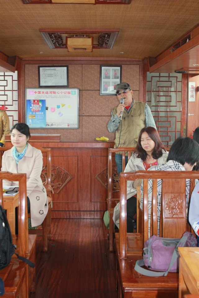 尽管阴雨绵绵,但丝毫不减大家欣赏运河的兴致。在船上,大家先听专业人士介绍了解京杭大运河的历史、现状和文化轨迹,零距离感受江南水乡的流光溢彩与水墨韵味。同时把茶言欢,听运河语,欣赏沿途两岸千年运河的风土景观。在姜岳斌教授的一首《蒙古人》中,文学沙龙拉开了序幕,汪化云教授饱含深情地朗诵了余光中先生的《春天,遂想起》,陈朝霞老师吟唱了一首《那就是我》,随后大家纷纷以“我的江南故事”为主题进行了或吟或诵的分享活动。外面雨水不断敲打着船舷,船内却春意盎然,大家兴致勃勃地分享着有关江南运河的故事。行至余杭塘栖,大家行走在这个古镇上,感受着漕运对古镇风土人情的影响,触摸着古镇的美,纷纷合影留念,本次的文学沙龙活动也圆满结束。