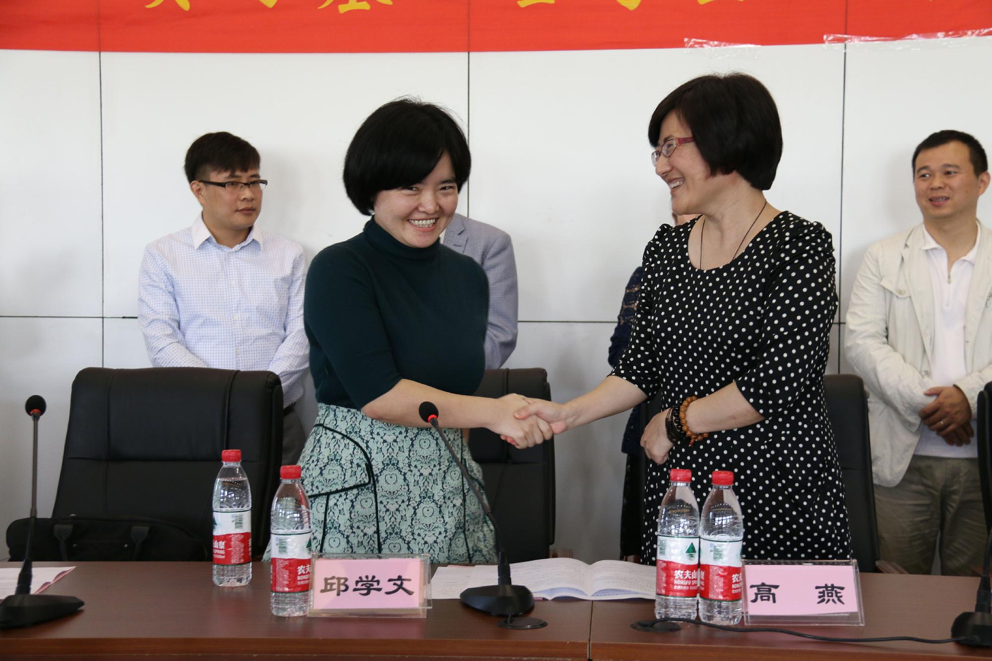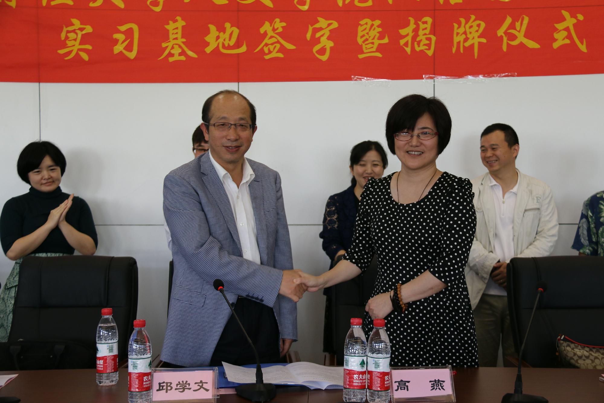 在几位领导讲话结束后,姚红副院长分别与国际学院副院长邱学文、上海瑜得坊文化传播有限公司(瑜得坊国际教育中心)教学主管张晓、上海早安汉语暨上海盛兴文化传播有限责任公司董事长杨凤华签订为期三年的实习基地协议。由高燕副书记与三家单位的领导为实习基地揭牌。