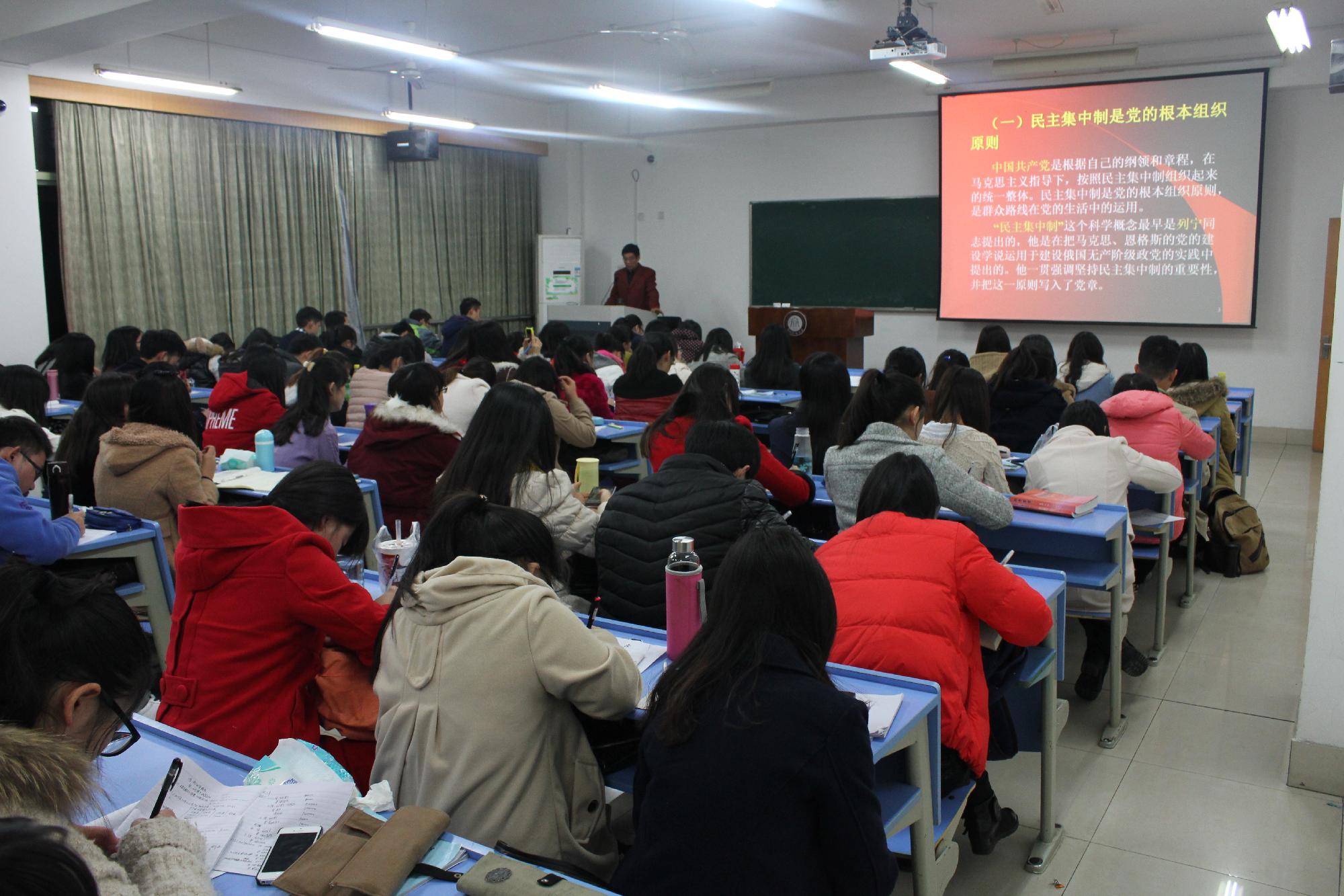 邀请了校内外五名主讲老师,他们围绕了多个角度、多个主题进行全方位授课。12月6日下午,首先,来自思政部的总支副书记何历宇老师,结合了习近平总书记的讲话内容,围绕“坚持中国特色社会主义道路”的主题,用GDP等各种数值对比了中国与多个国家的经济发展差别,从而了解到我国经济发展的优点和缺点在哪些方面。接着,校党委组织部副部长范建峰老师向大家阐明了“党员的权利、义务和共产党员的修养问题”,并且讲述当今中国的社会现状、改革开放取得的成就与毛泽东思想之间的关系、为何社会主义是中国的必由之路以及面对改革开放如何看待传统文化,金融学院党总支杨鹰彪书记结合中纪委近年来的惩腐规划以及国际组织发布的清廉指数为大家讲述“党的组织原则、党的纪律以及党风建设”三方面内容。12月9日下午,漫画人