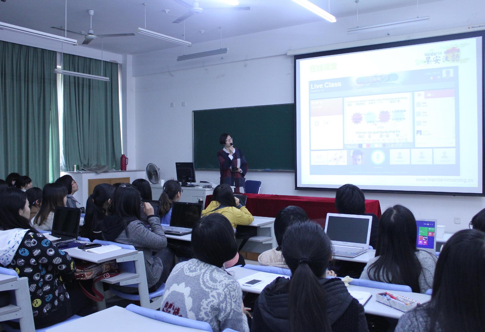 “早安汉语”实习基地的邀请,上海“早安汉语”学校校长杨凤华携公司网络孔院项目经理时欢欢来到7号楼107教室,讲授了一堂别开生面的“应用语言学”课,深受学生好评。课程由人文学院副院长姚红教授主持,国际汉语系主任铁徽博士、“应用语言学”任课教师刘亚辉副教授全程参与课程讲授。