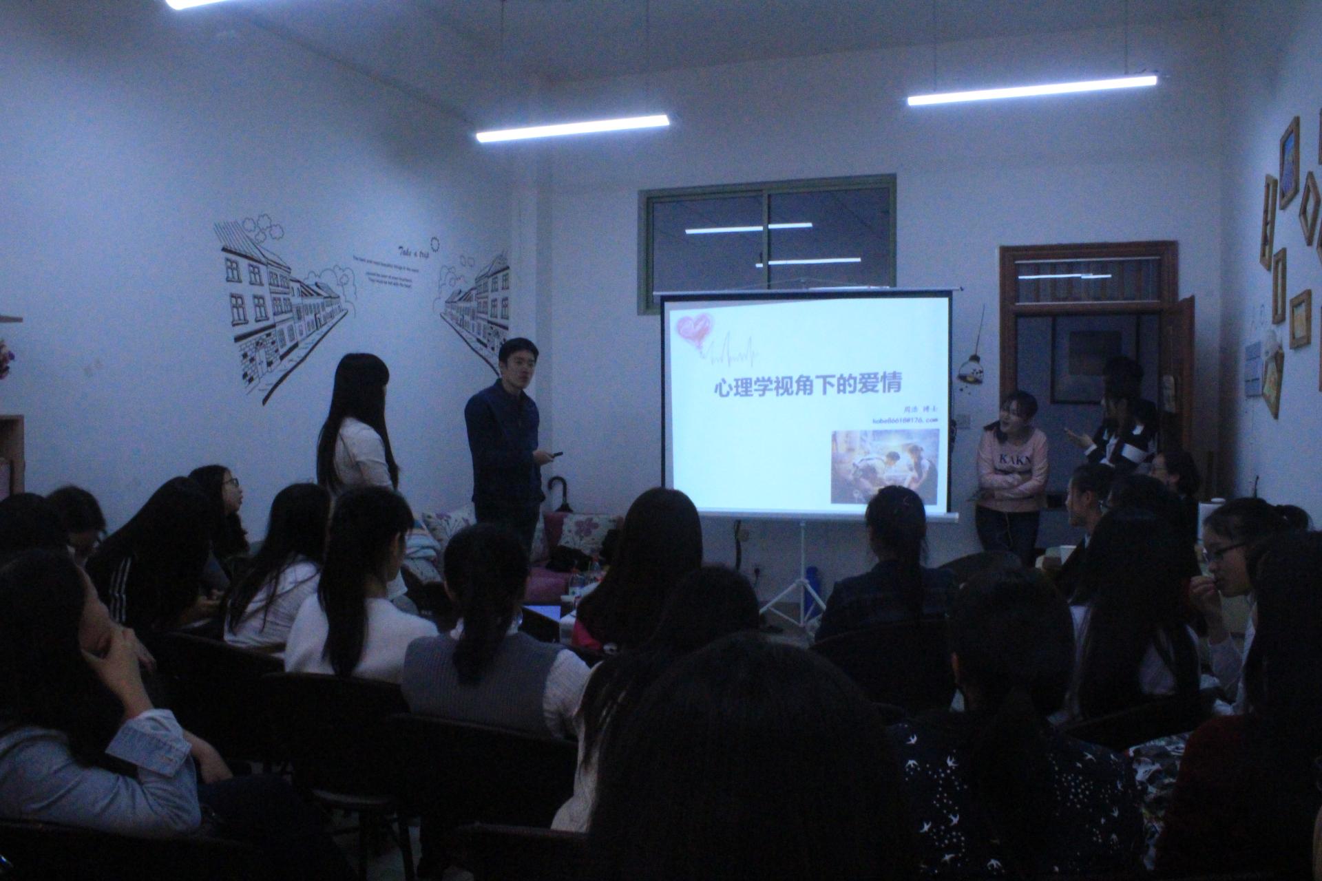 4月28日下午14时,在学院楼402举行了一场题为“心理学视角下的爱情”为主题的心理沙龙活动,主讲老师为中国人民大学心理学博士周浩老师。心理辅导员袁慧兰老师和40多位同学参加了此次活动。