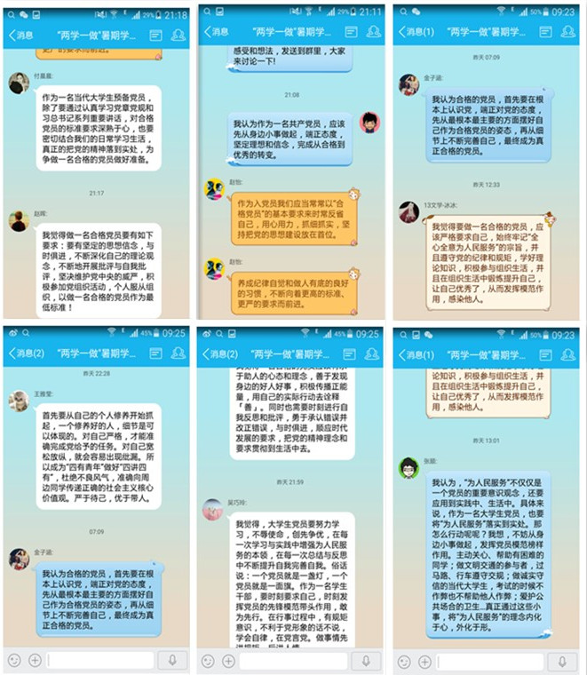 学生第一党支部在前期学习观看”做合格党员”视频的基础上, 于7月14日,利用“‘两学一做’暑期学习群”,以“做合格党员”为主题在线进行了一场专题学习交流讨论。