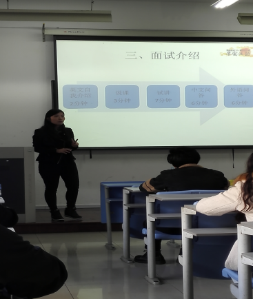 汉语国际教育专业的学生及早了解汉语教师资格证考试制度及内容,12月8日下午在A楼106教室,上海早安汉语学校资深面试培训教师郭雯老师为汉语系的同学做了“七分钟出彩课堂”的讲座。国际汉语系铁徽博士主持,系主任孙德平副教授参加了讲座。