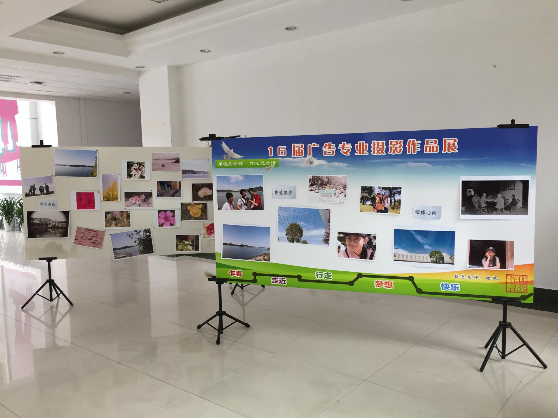 在同学们的精心准备下,展会如期而至。两个班的同学在陆斌老师的指导下,用单反捕捉到了生活中很多美丽的画面。有龙门古镇的江南水乡之景;有千岛湖的潋滟水光山色;有校园内青春年华之态等等。再加上同学们在展板上的留言和涂鸦,展会吸引了很多师生前来观展。