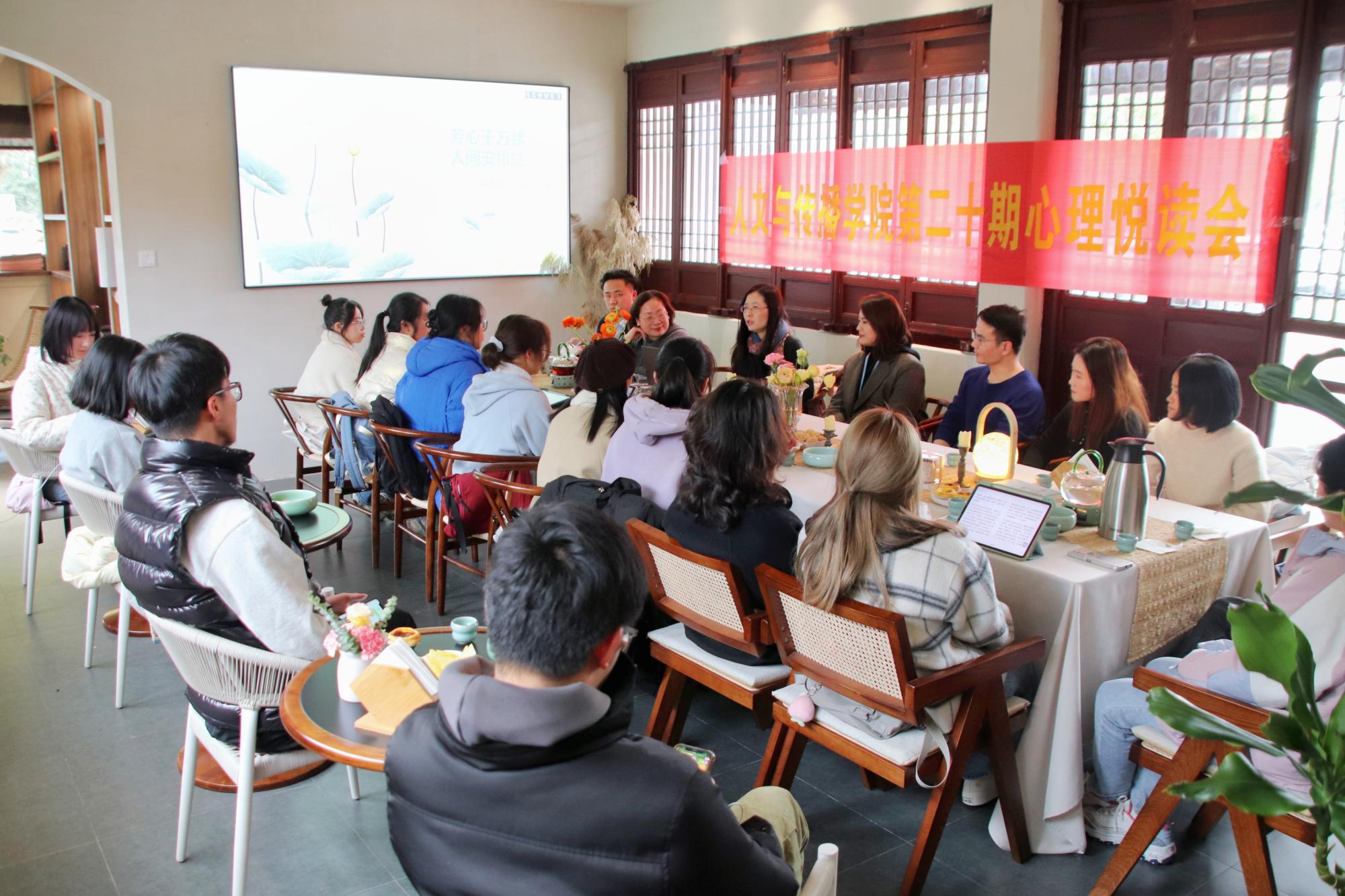 第二十期心理“悦”读会在下沙三沐书苑举办。本次读书会由崔霞老师主讲,袁慧兰老师主持,吴智斌、毋丹、徐键、史婷婷、毛婉婧、马羚凯等老师参加,二十余位同学围桌而坐,共同走进吴晓波的《人间杭州》。