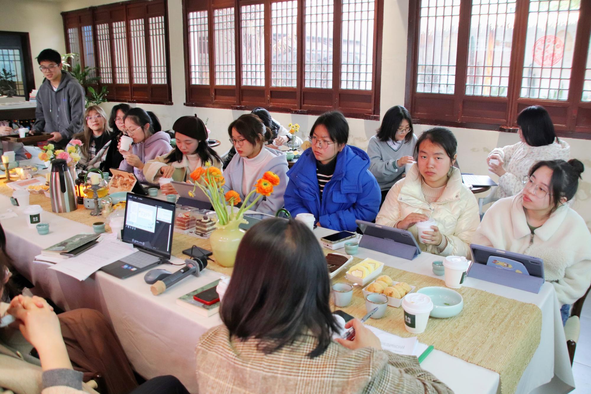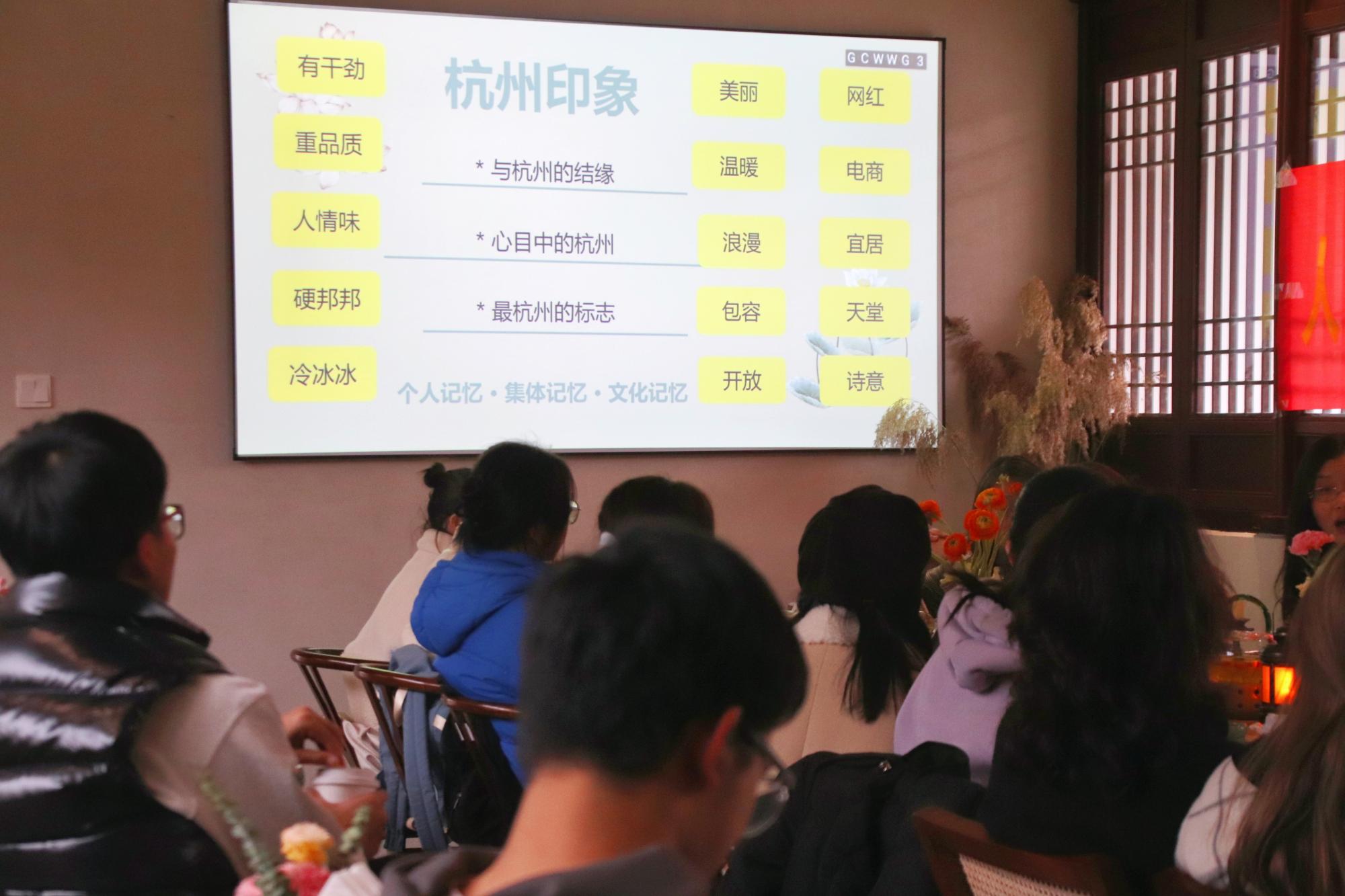 最后分享时,其他老师也纷纷谈起了自己对杭州的认识与交集,那是两三人步入茶馆,在缕缕茶香中赏景赋闲;是看遍春夏秋冬、风霜雨雪、朝阳夜幕的西湖掠影;是走进剧院,欣赏戏曲纷繁绚烂下的杭州故事……
