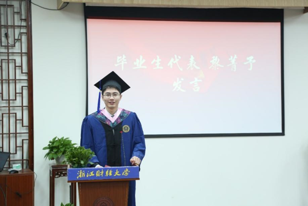 毕业生代表黎菁予代表汉语国际教育专业硕士毕业生深情发言,他回忆起初至浙财时作为新生代表做的新生代表发言,重温在浙财度过的美好时光,感激学校的悉心培养、老师的辛勤付出以及同学们的并肩前行。最后,黎菁予同学表示作为人文学院的一份子,必将带着学院培育的世界眼和中国心,与更广阔的世界接触,尽情发挥所长。