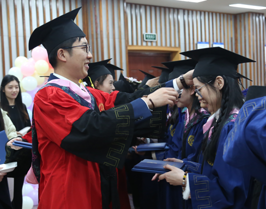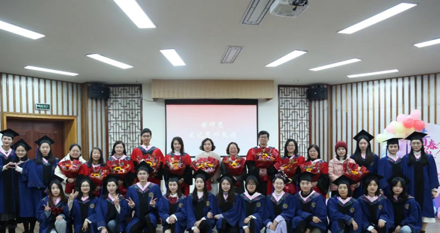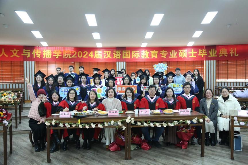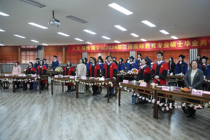 党委书记罗金艳,副院长毋丹,毕业生导师吴智斌、孙德平、崔霞、付伊、姚晓萍、苏浩,研究生辅导员,研究生秘书,以及19名2024届汉语国际教育专业硕士毕业生出席典礼,仪式由院党委副书记袁慧兰主持。