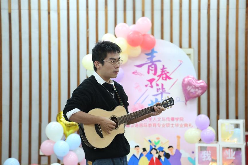 同时,23级汉硕高任飞代表学弟学妹们手持吉他,用自己的声音和旋律献唱离别曲目《光阴的故事》。他们也向学姐学长们传递了最真挚的祝福,双方的深情与祝愿交织成一曲和谐的交响。