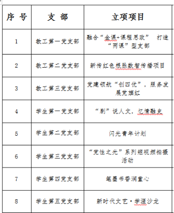 经过支部申报,学院党委评审和后期完善,《融合“金课+课程思政” 打造“两课”型支部》、《新传红色根脉数智传播项目》、《党建领航“创四优”,服务发展党旗红》、《“剧”说人文,忆情融史》、《闪光青年计划》、《“党性之光”系列短视频拍摄活动》、《笔墨书香润童心》、《新时代文艺·学涯沙龙》等8个项目获得立项支持,学院“一支部一品牌”党建布局不断得到夯实。下一步,各立项项目将按照创建活动的整体安排和制定的方案措施,认真组织实施,精心培育打造。