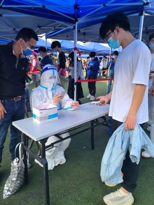教工第一党支部党员苏浩、史婷婷报名参加4月20日和21日校集中核酸检测点的志愿服务工作。闷热的外部环境、身着防护服,近六个小时不吃不喝不上厕所,他们始终保持高昂的斗志和良好的精神状态,保质保量地协助各部门完成了学校全员核酸检测。