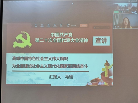师生党员,讲授学习贯彻党的二十大精神专题党课,并受聘分党校校外特聘导师。马瑜以生动的语言、鲜活的故事讲述了参加党的二十大的切身感受,围绕如何完整准确学习贯彻党的二十大精神进行了解读、宣传阐释。学院理论学习中心组成员、党委委员、纪委委员、支部书记及师生代表参加了学习会,学院党委书记高燕担任主持。
