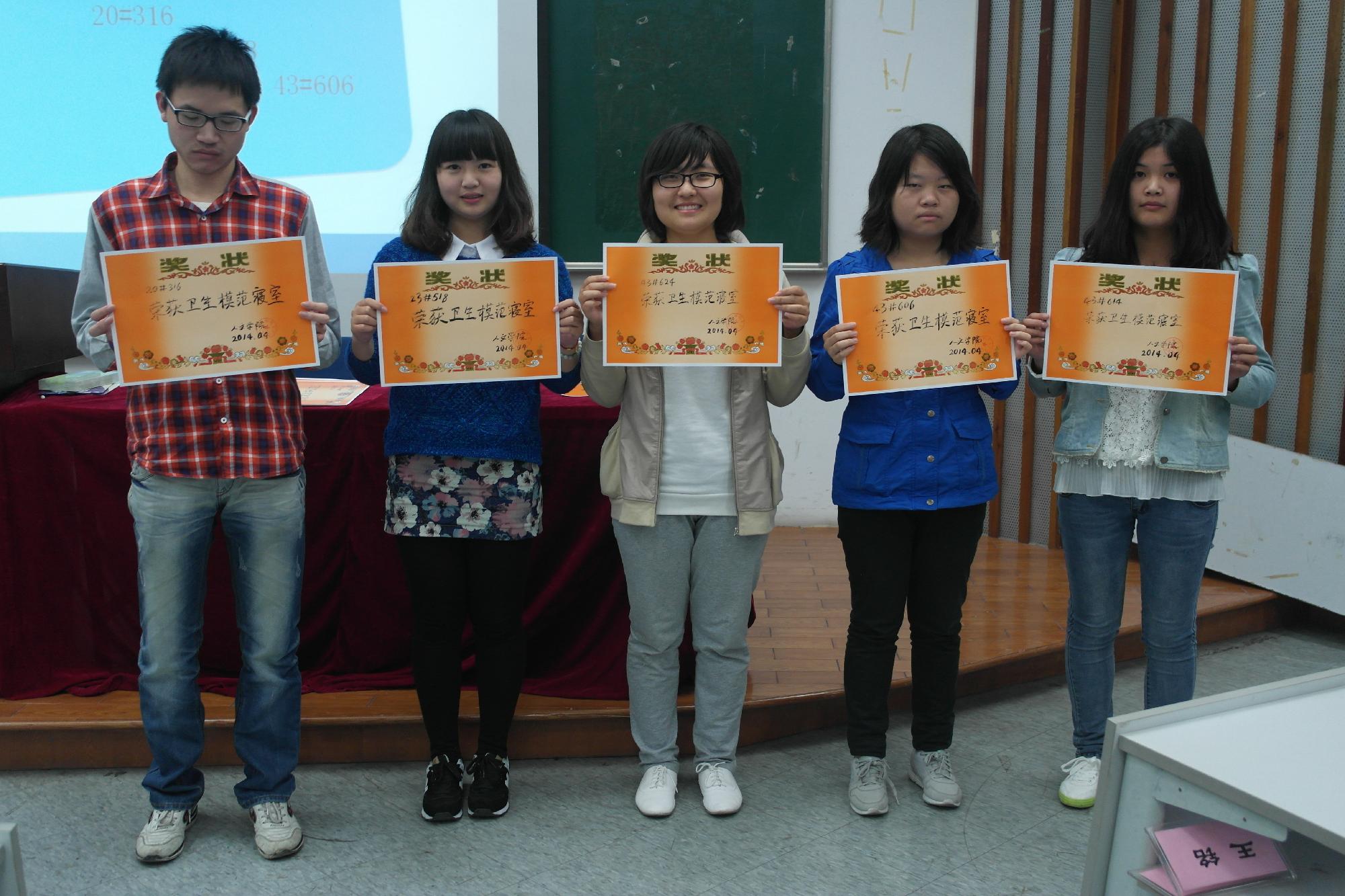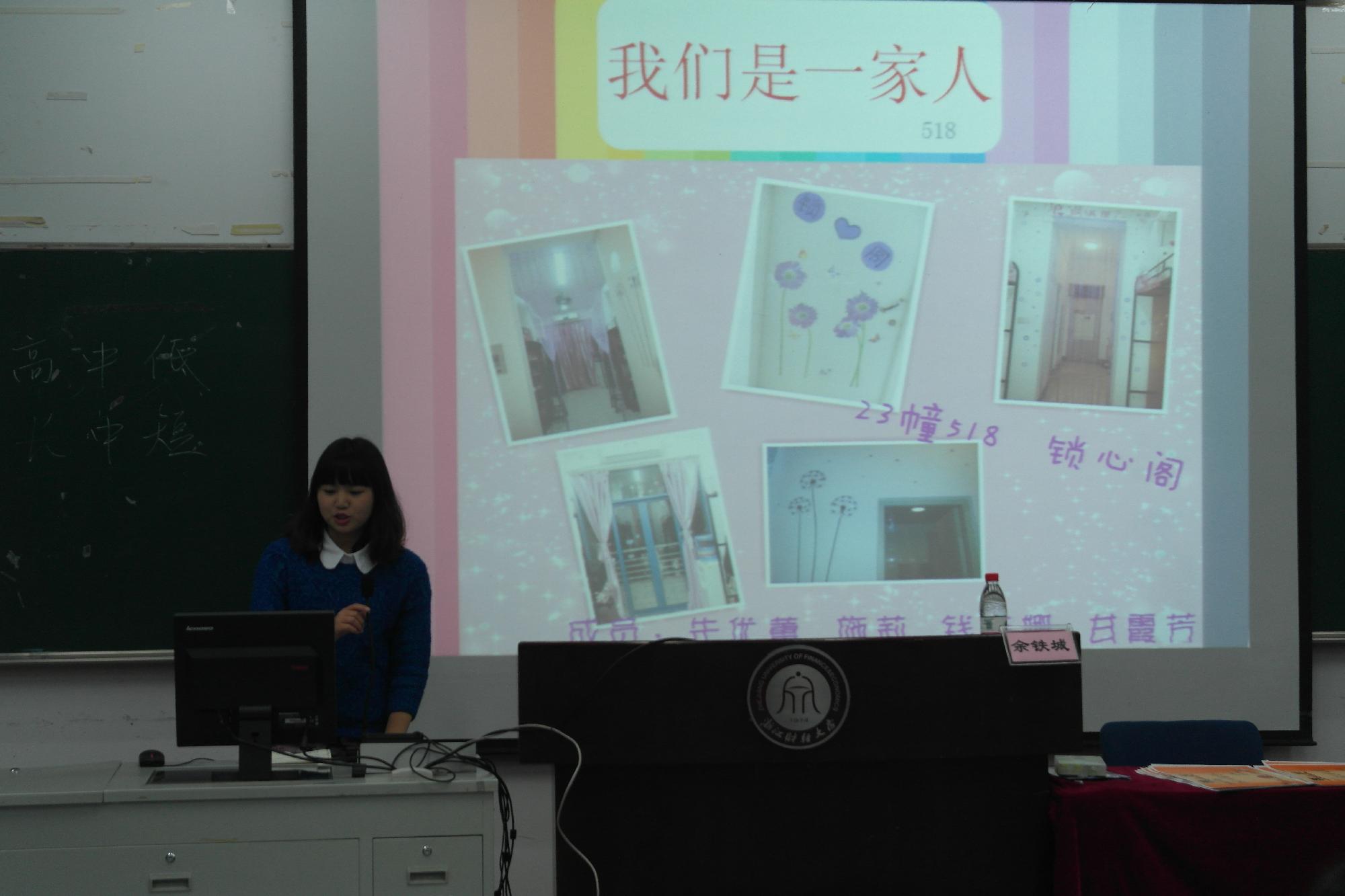 活动第二项是宣布特色寝室表彰大会的奖项以及获奖名单。奖项分别有文艺体特色寝室、团结和谐寝室、卫生模范寝室、最佳学风寝室以及十佳寝室长这五项。获奖的寝室有56幢216、43幢618、20幢316、23幢512等十九个寝室,朱优蕾等十个寝室长当选为十佳寝室长,并由工作人员给获奖寝室及寝室长颁发了奖状和奖品。活动过程中获奖寝室代表上台展示了所在寝室建设成果,并分享了寝室建设的经验,为更好地建设学习型公寓寝室给出了很好的建议。