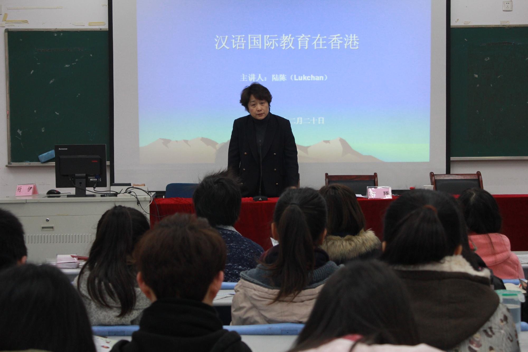 上午8点,香港陆陈汉语国际教育集团董事长、陆陈汉语语言学校校长陆陈女士携两位教育副总监来到7号楼112教室,以“汉语国际教育在香港”为题,从全球汉语国际教育的大趋势、香港汉语国际形势、汉语国际教育的全新理念、教学方法等方面为大家上了生动一课。