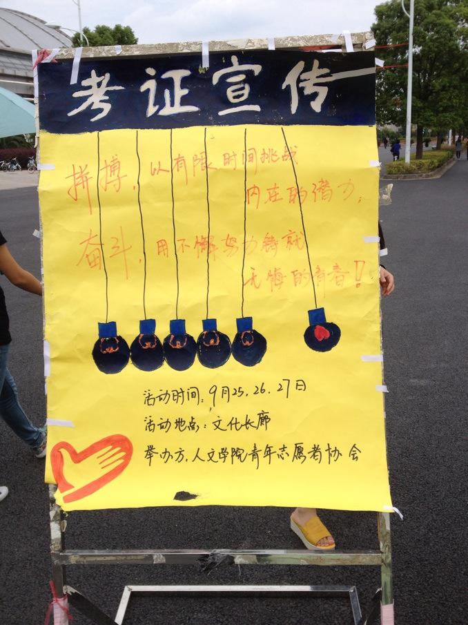 2013年9月25至27日中午,人文学院青年志愿协会开展了“考证宣传”活动。志愿者们分别通过在寝室扫楼宣传和文化长廊设定宣传的形式,为在校大学生提供考证咨询平台。