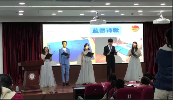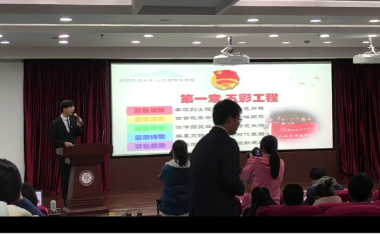 2018级文传(1)班班长兼团支部副书记郭继同学以《新时代、新青年的“五彩工程”》为主题,向在场评委和观众展示了班级团支部开展的“红色足迹”、“金色历史”、“绿色环境”、“蓝图诗歌”和“紫色团建”五大特色活动。六名同学现场朗诵了支部自己编写的歌颂红船精神的“蓝图诗歌”,充分展现漫画人