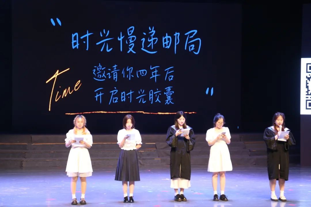 毕业生们同一起回顾了四年前共同埋下的时光胶囊的瞬间,并上台朗读自己四年前写的时光胶囊,历数记忆中鲜活的点滴。