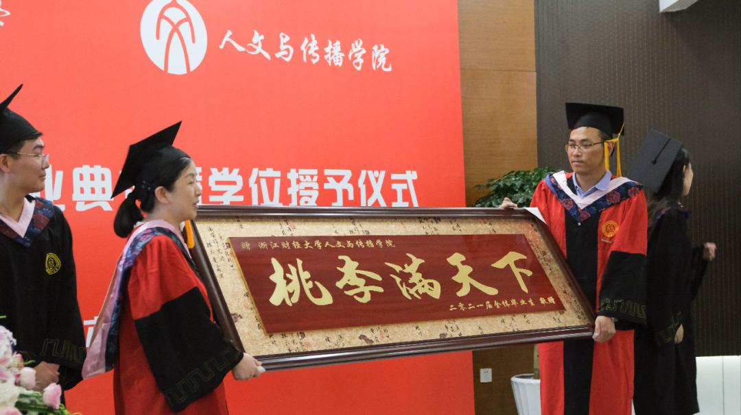 浙江财经大学副校长徐晓东,人文学院院长周保欣、党委书记高燕、副院长陈静、院长助理吴智斌、中文系赵顺宏、国际汉语系杨建忠、广告系胡文财、网络与新媒体系洪艳等九位老师身着导师服上台,与受礼的毕业生依次握手,并为他们颁发学位证书和拨穗。四年上下求索,满获沉甸甸的知识,人文学子已如麦穗般成熟。将流苏从右拨至左这一个动作,将学子们的青葱岁月、求学生活悄悄翻过,他们的人生也从此进入了崭新的篇章。在仪式的最后,各位领导老师和全体毕业生们手执彩色纸飞机,在学涯湖畔,让梦想随着纸飞机飞向远方。