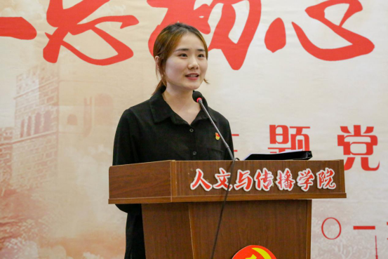 党员代表发言环节,学院教师党员吴智斌和学生党员谭珏惠上台发言。吴智斌老师从生活、工作、教学、课堂思政等多个方面述说了一个党员教师坚定理想信念、爱岗敬业,忠诚于党的教育事业的“初心”与“本性”,赢得了在场党员的共鸣。学生党员谭珏惠表示大学生党员要把自身的发展和祖国的前途命运紧紧连在一起,主动承担起实现中国伟大复兴的历史重担,争当模范,发挥好党员的引领示范作用。