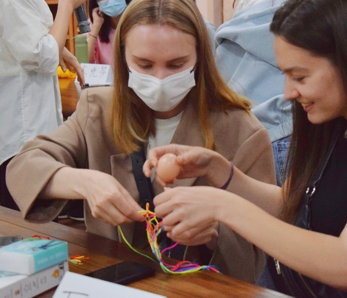 “挂蛋”是立夏常见的习俗之一。这天,人们会将煮熟后完好的鸡蛋装在编好的丝网袋内再挂在胸前,目的是避免“疰夏”,也象征一年无灾无病,健康成长。为了让学生们亲身体验中国传统习俗,学院为参加本次活动的学生准备了鸡蛋、丝线和网袋,在师生的指导下,中外学生们一起动手体验“挂蛋”的乐趣。